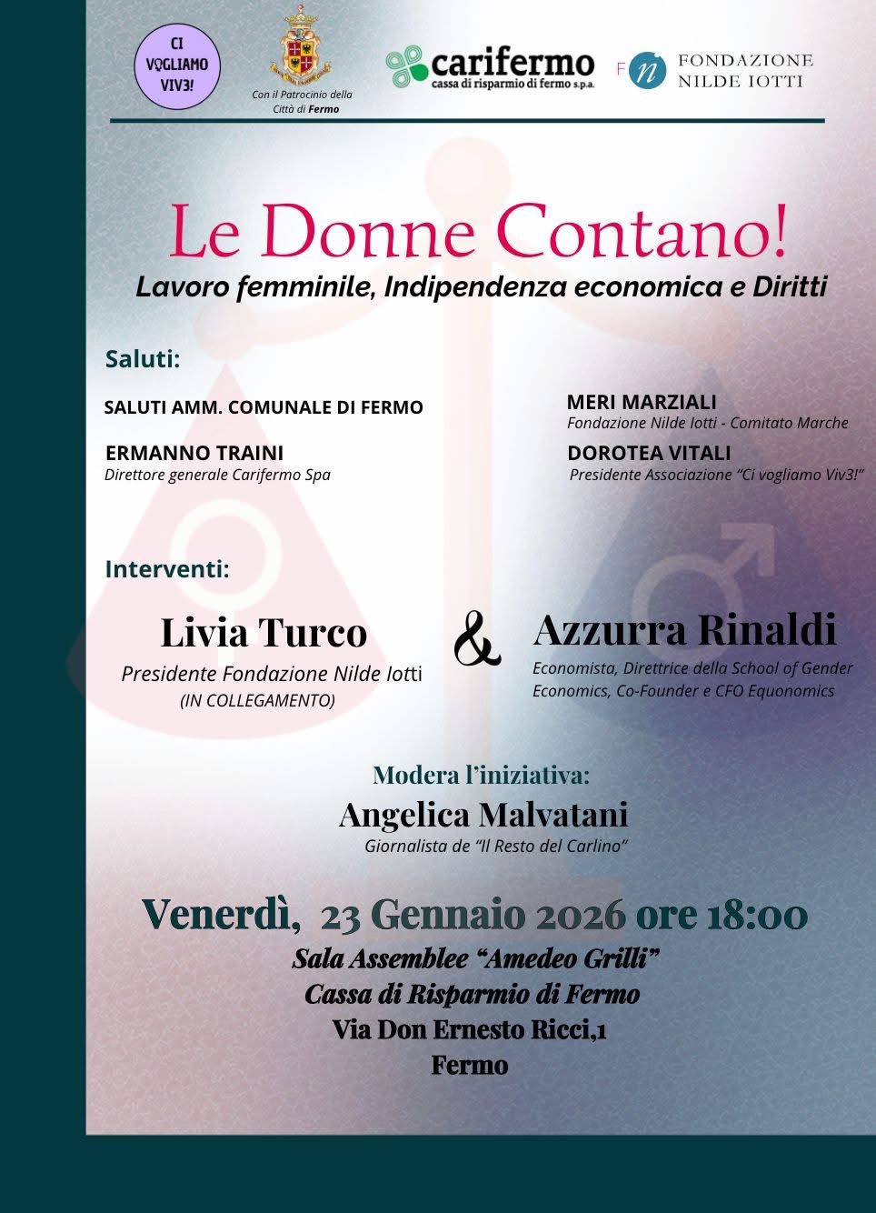 Un appuntamento dedicato al lavoro femminile, all’indipendenza economica e ai diritti. E’ questo il cuore dell’iniziativa “Le Donne Contano!”, promossa dall’associazione “Ci vogliamo vive!”, con il patrocinio del Comune di Fermo, in collaborazione con Carifermo Spa e Fondazione Nilde Iotti.
