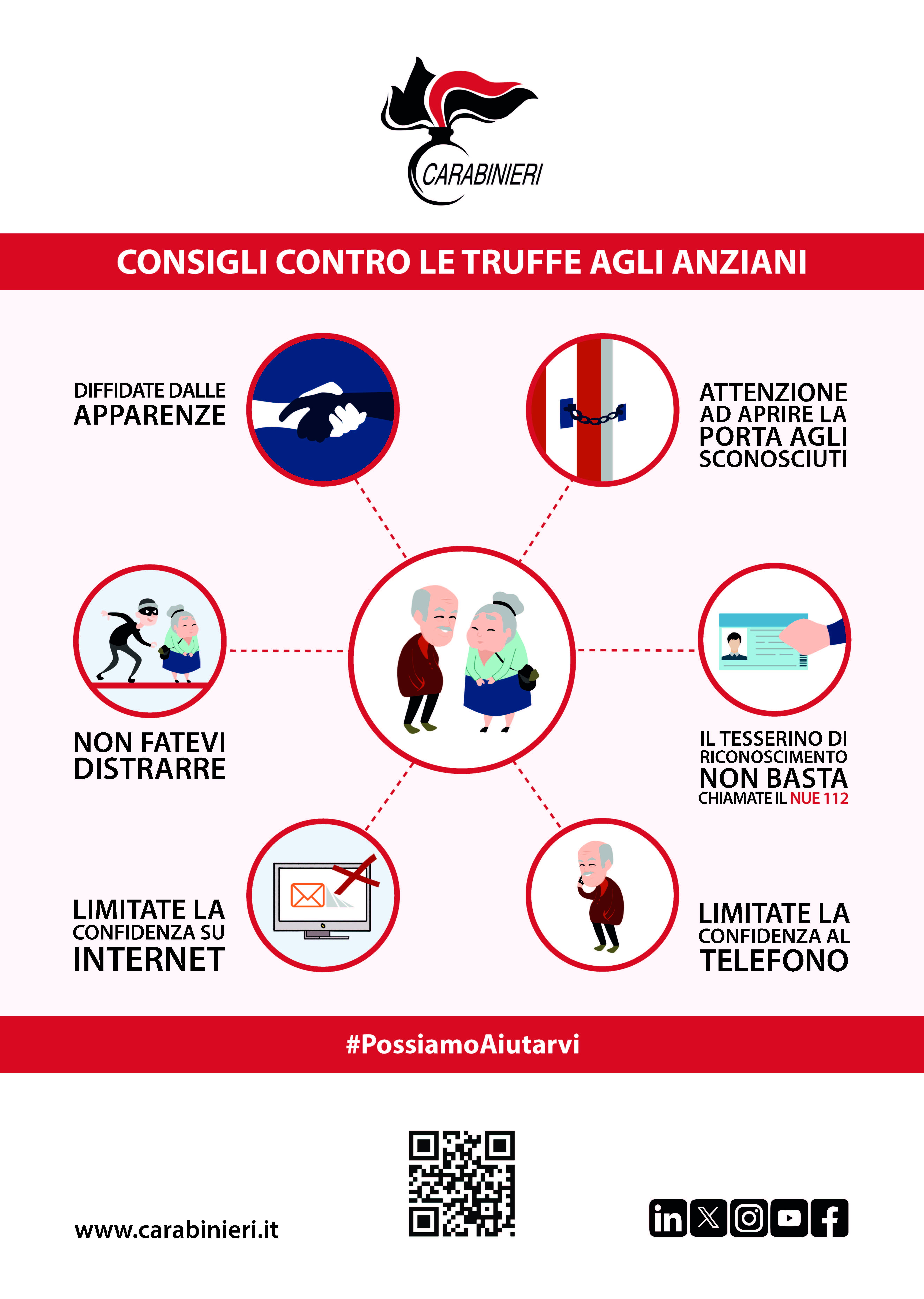 Consulta QUI la locandina, realizzata dall'Arma dei Carabinieri, in tema di prevenzione delle truffe in danno degli anziani al fine di accrescere la prevenzione e la funzione di rassicurazione sociale.